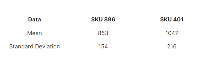 You are working with the marketing team for a FMCG firm that produces shaving cream. The team believes that sales of some of the products are closely related to sales of other products. They want you to explore this in a little more depth for two products, SKU 896 and SKU 401. Unfortunately, all of the base sales data for these products has been destroyed. All that you have is the weekly summary data: