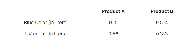 Consider two products SKU M50 (Product A) and Z43 (Product B). You are asked to calculate the ‘amount of blue color bath’ for Product A and Product B. The following table indicates the amount of blue color (in liters) and UV agent (in liters) needed to prepare one litre of Product A and one litre of Product B.