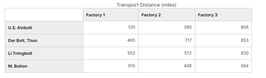 You are trying to plan the weekly flow of bolts from these suppliers to your factories. Based on the current contract with your transportation carrier, the unit transportation cost for a case of bolts is $0.05 per mile from any of the suppliers to any of the factories. The distances between the four suppliers and the three factories are given in the table below.
